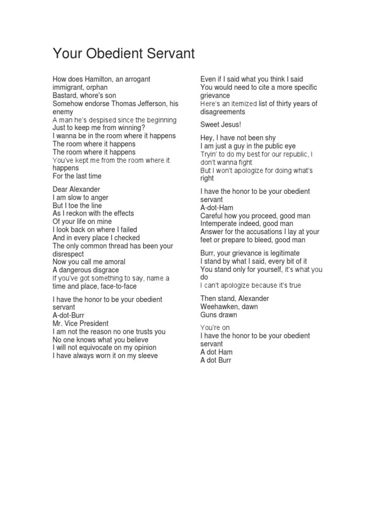Your Obedient Servant Lyrics : Hamilton Lyrics Your Obedient Servant Wattpad : We did not find results for:. We did not find results for: Maybe you would like to learn more about one of these? Check spelling or type a new query.